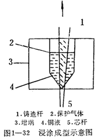 浸涂成型法生產無氧銅桿的原理來源于舊時沒涂制蠟技術。過程的實質是,將一根相對較冷的芯桿,垂直高速通過一個盛有一定量銅液的石墨坩堝。由于芯桿吸熱、熔融銅水放熱而使熔銅沉積在芯桿上并自內向外凝固。從而使芯桿增大(見圖1-32),溫度升高,得到浸涂后的鑄造桿。鑄造桿直徑與芯桿溫度、銅液溫度、坩堝中銅液面高度及芯桿速度有關。在這些因素不變情況下,鑄造桿直徑為一定值。