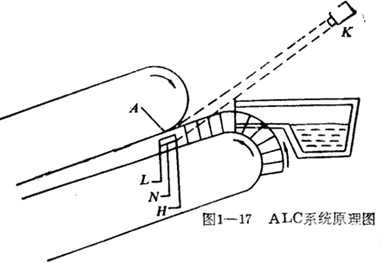 了自動溶池液面控制系統 (Automatic Pool LevelControl System 縮稱ALC系統)。其工作原理 (圖I一17)是由光學監測器K攝取鑄機中溶池的液位, 它以測量熔池側銅擋板A區的輻射強度為信息源。如圖1-17,當銅液浸滿“A”區 時為高液位“H”;銅液少,不能浸入A區時為低液位“L”,液面處于“L”和 “H”之間為正常液位“N”。